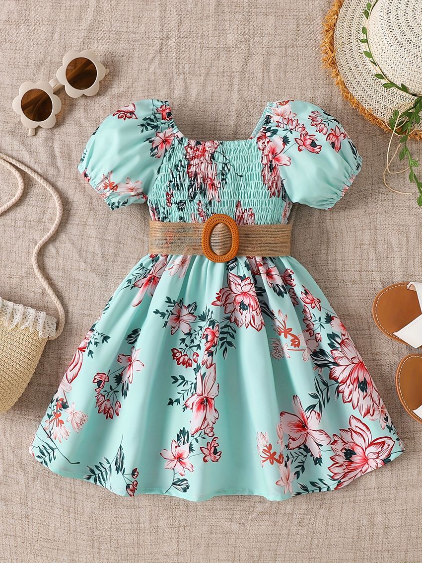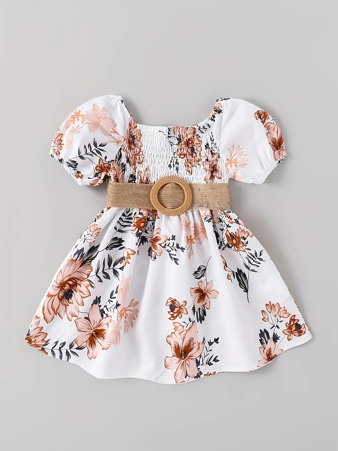 Cross-Border Ins Baby Girl Summer Style Puff Sleeve Flower Print Belt Waist Sweet Dress